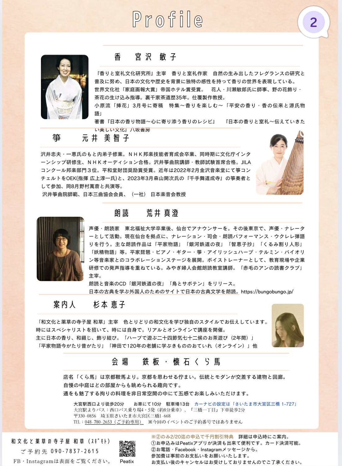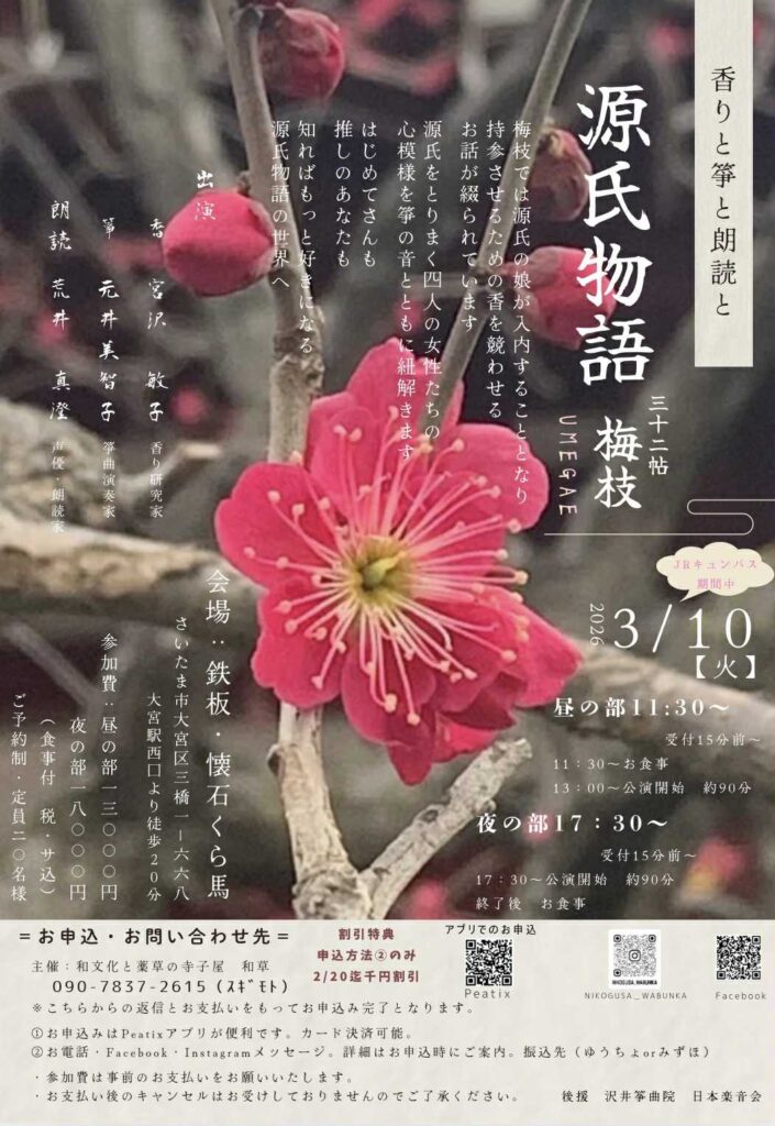 【演奏会情報】3月10日(火)香りと箏と朗読と源氏物語